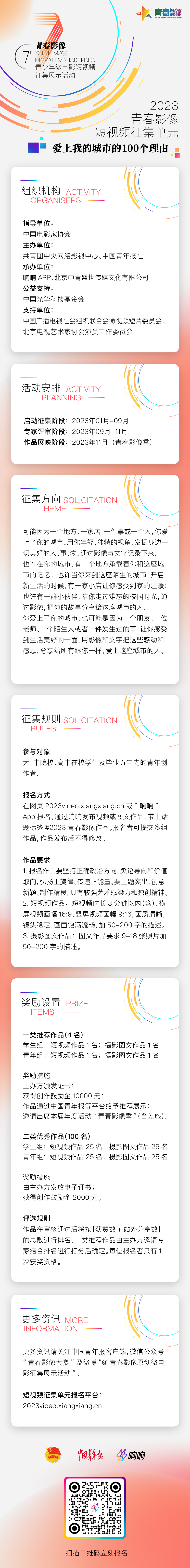2022年12月31日,在中國電影家協(xié)會的指導(dǎo)下,由共青團(tuán)中央網(wǎng)絡(luò)影視中心、中國青年報社、珠海奇妙科技有限公司等單位組織開展的第七屆青春影像——“愛上我的城市的100個理由”短視頻征集單元正式啟動!
