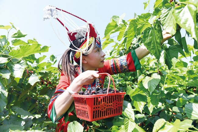 4月24日,金華市武義縣桃溪鎮(zhèn)錦平村內(nèi),身著畬族服飾的村民們正在采摘桑椹。通常,桑椹采摘到5月中旬結(jié)束,每年能帶動(dòng)村集體增收7萬(wàn)元左右。據(jù)了解,該村積極發(fā)展桑椹種業(yè),帶動(dòng)村民參與采摘,并對(duì)桑椹進(jìn)行桑椹酒、桑椹果干等產(chǎn)品開(kāi)發(fā),增加附加值,讓村民增收致富。(章陳波、朱翚)
