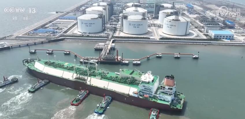 在天津,一艘滿載9萬噸液化天然氣的運輸船在中國石化天津液化天然氣接收站碼頭接卸,這是該站自6月以來接卸的第8船。