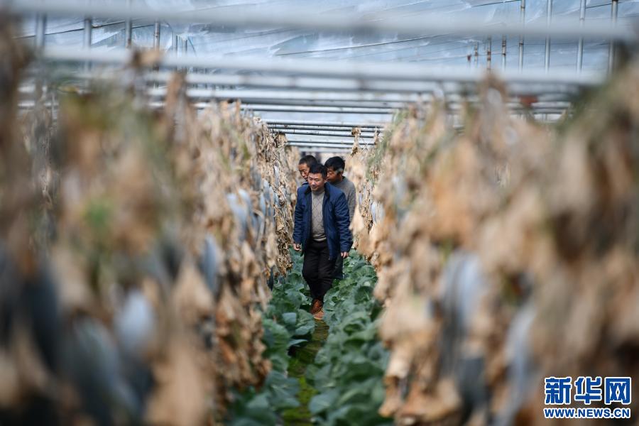 陳千(前)和種植戶在大棚里查看蔬菜長(zhǎng)勢(shì)(2月25日攝)。新華社記者 晉美多吉 攝