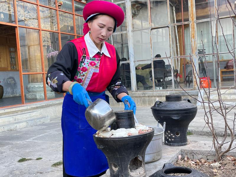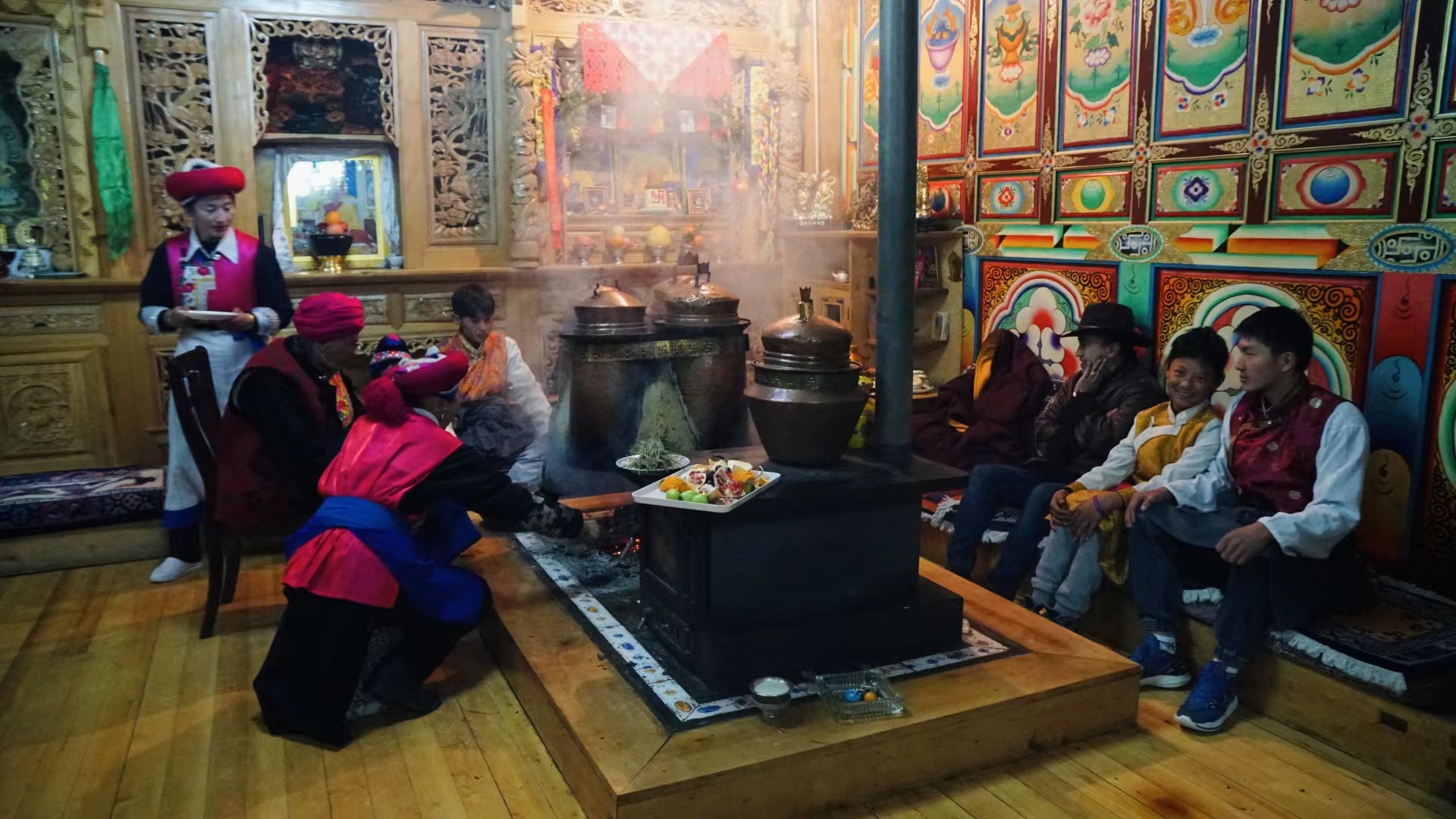 傍晚時(shí)分,“年夜飯”準(zhǔn)備完成,初稱站在火塘邊把剛和好的稀泥一層一層地刷到火塘上,“這是藏歷新年的添新土儀式(藏歷新年接福習(xí)俗),表示我們對(duì)來年日子風(fēng)調(diào)雨順、紅紅火火的美好期待?!背醴Q把這些傳統(tǒng)習(xí)俗認(rèn)真地教給家里的孩子們。