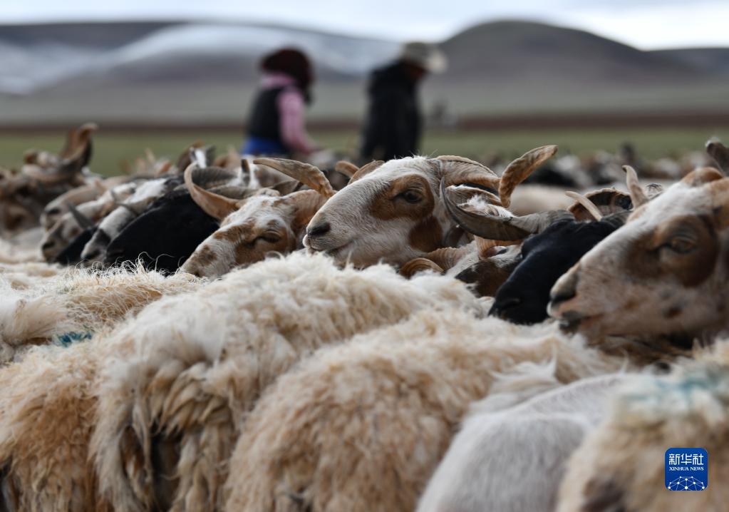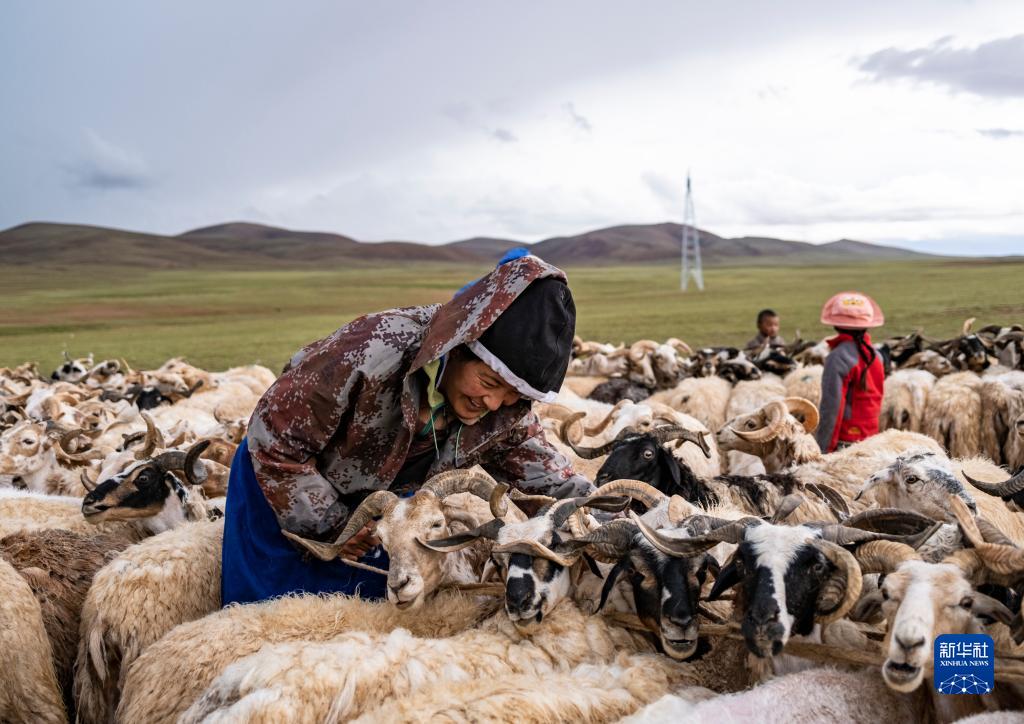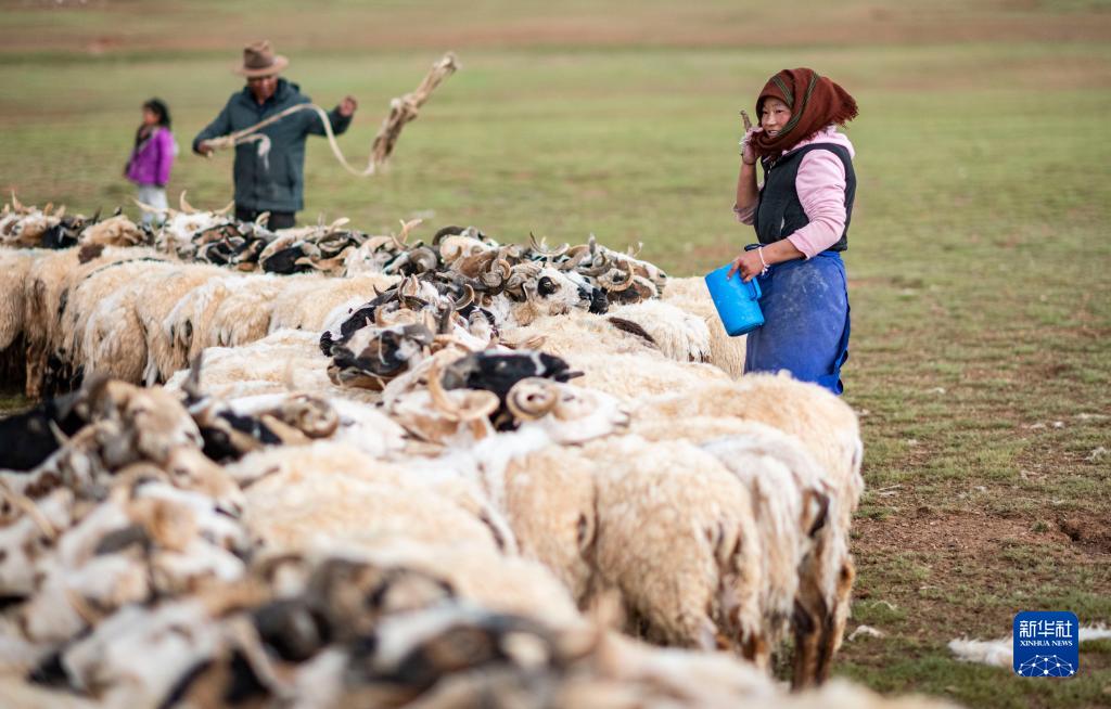 7月12日,在西藏那曲市雙湖縣多瑪鄉(xiāng),牧民在擠綿羊奶。新華社記者 周荻瀟 攝